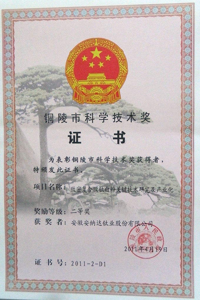 銅陵市科學技術獎證書
